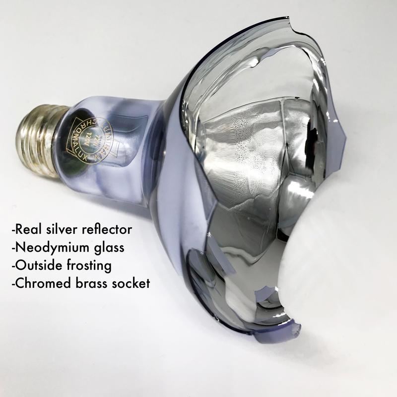 The R40 /150W Chromalux® Enhanced™ Full Spectrum Reflector flood lamp Utilizes the pure neodymium glass as the popular Chromalux® incandescent. This Flood light offers 18% more light, better lumen efficiency, and a whiter light spectrum (4200K vs 3750K).